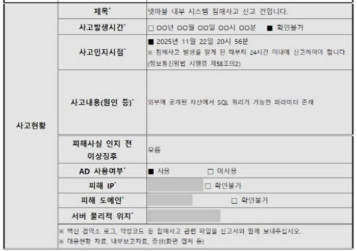 그러나 사흘 뒤인 11월 25일 오후 8시 40분이 돼서야 신고가 이뤄졌다. 신고서에는 '외부에 공개된 자산에서 SQL 쿼리 실행이 가능한 파라미터가 존재한다'는 내용이 담겼으며, 이는 침해사고가 발생한 것으로 판단되는 정황이다.