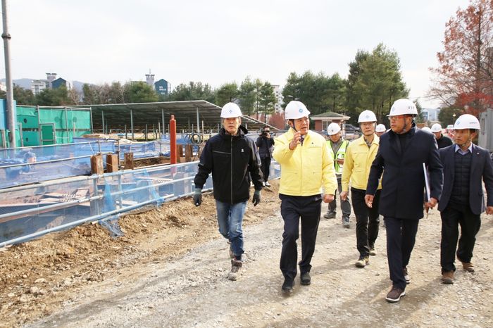 최대호 안양시장이 지난 26일 청계통합정수장 고도정수처리시설 공사 현장을 방문해 진행상황을 점검하고 관계자들을 격려했다. ⓒ안양시 제공
