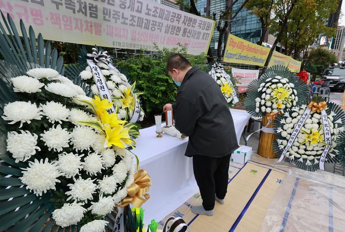 민중기 특별검사팀 사무실이 있는 서울 종로구 KT광화문빌딩 웨스트 앞 인도에 '양평 공흥지구 특혜 의혹'과 관련해 수사 받다 숨진 채 발견된 양평군 공무원 A씨의 분향소가 마련돼 있다. ⓒ연합뉴스