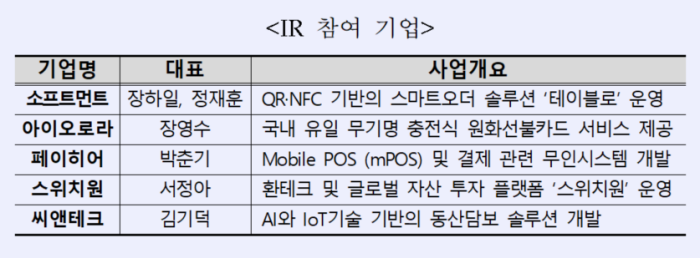 이날 라운드에는 한국성장금융, LB인베스트먼트, 우리벤처파트너스 등 국내 유수 VC 및 유관기관 관계자 등 총 100여명이 참석한 가운데 국내 유망핀테크 스타트업 5개사가 IR을 실시했다.