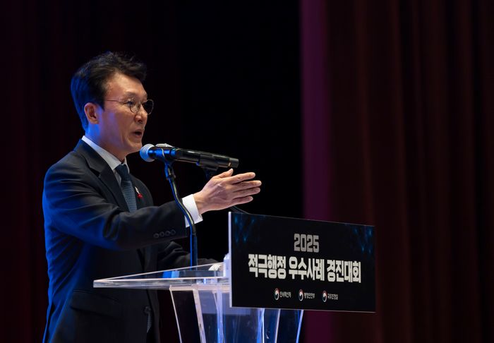 김민석 국무총리가 27일 정부세종청사 6동 대강당에서 열린 적극행정 우수사례 경진대회에서 격려사를 하고 있다. ⓒ연합뉴스