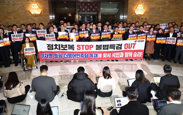 장동혁 국민의힘 대표와 송언석 원내대표 등 의원들이 지난 27일 오후 국회 본회의장 앞에서 특검 규탄대회를 열고 구호를 외치고 있다. 이날 국민의힘은 본회의에서 추경호 의원 체포동의안에 대한 투표를 하지 않고 회의장을 떠났다. ⓒ뉴시스