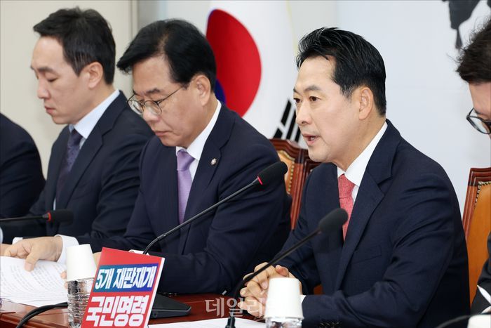 국민의힘 장동혁 대표(오른쪽)가 지난 20일 오전 국회에서 열린 국민의힘 최고위원회의에서 모두발언을 하고 있다. 가운데는 송언석 원내대표, 왼쪽은 김민수 최고위원 ⓒ데일리안 홍금표 기자