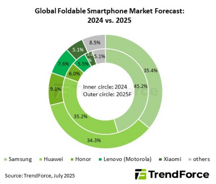 시장조사기관 트렌드포스에 따르면 올해 폴더블폰 출하량은 1980만대(점유율 1.6%)에 그칠 전망이다. 폴더블폰 시장이 주류 시장을 흡수하지 못하고 있는 상황에서 화웨이·오포·비보 등 중화권 업체가 빠르게 폴더블폰 점유율을 늘리며 삼성의 시장 지배력을 흔들고 있다.