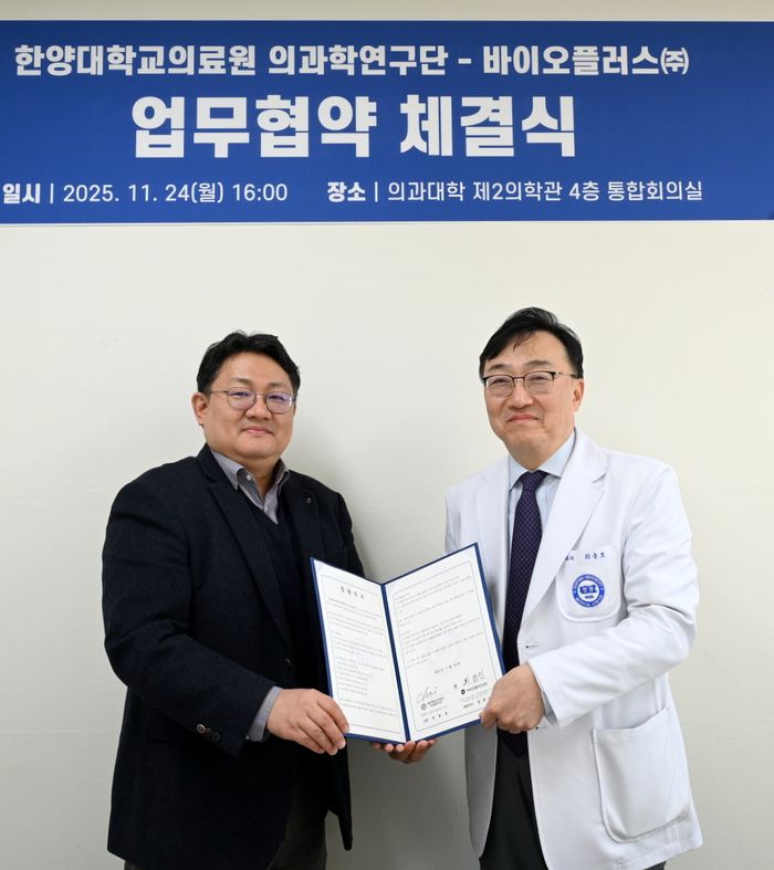최승인 바이오플러스 개발본부장은 “우수한 의료·연구 역량을 갖춘 한양대학교의료원과의 협력은 바이오플러스의 기술개발과 사업 확장에 큰 도움이 될 것”이라며 “상호 발전을 위해 다양한 공동 프로젝트를 추진하겠다”고 밝혔다