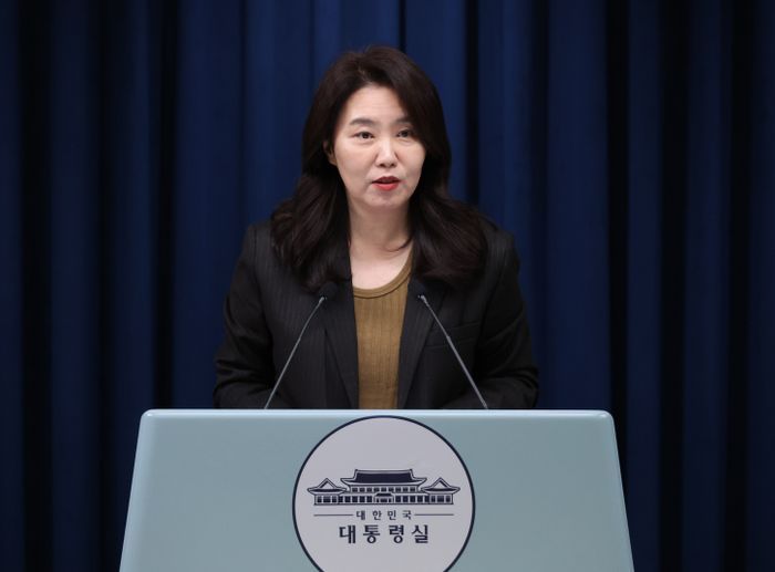 강유정 대변인이 28일 용산 대통령실 기자회견장에서 이재명 대통령의 초대 방송미디어통신위원회 위원장 인선 등 관련 브리핑을 하고 있다. ⓒ연합뉴스