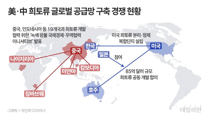 미국 내 희토류 분리·정제 등을 추진하는 복합 단지 설립을 논의하는 등 한국과도 관련 협력을 강화하고 있다. 지난달 29일 백악관이 공개한 팩트시트에는 포스코 인터내셔널과 미국 리엘리먼트 테크놀로지스사가 미국 내 희토류 분리·정제·자석 생산을 일괄 처리하는 ‘수직 통합형 복합 단지’를 세우는 데 협력한다는 내용이 담겼다.이는 첨단산업에 필수적인 희토류를 빠르게 확보하고 채굴부터 가공·생산에 이르기까지 서방 중심의 희토류 공급망을 빠르게 구축하기 위한 것으로 풀이된다.