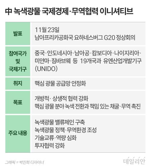시진핑(習近平) 중국 국가주석은 앞서 지난해 11월 브라질 리우데자네이루에서 열린 G20 정상회의에서 "중국은 녹색광물 분야 등에서 국제협력을 지속적으로 강화하길 원한다"고 발언한 바 있다. 이후 1년 만에 관련 국가들과 녹색광물 이니셔티브를 출범하며 자원 네트워크를 더욱 단단히 구축하고 나선 것이다.