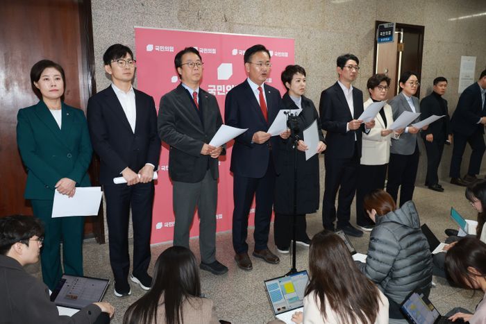 국민의힘 유상범 등 운영위원회 위원들이 26일 국회에서 국회법 관련 성명을 발표하고 있다. ⓒ뉴시스