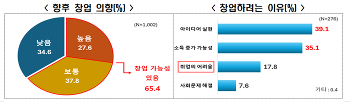 미취업 청년의 향후 창업 의향 중 ‘높음’ 응답은 27.6%였으며, ‘보통’ 응답 (37.8%)까지 포함하면 10명 중 6명(65.4%)은 창업 가능성을 배제하지 않고 있는 것으로 나타났다. 이들은 자신의 아이디어 실현(39.1%), 소득 증가 가능성(35.1%) 등을 창업에 도전하고 싶은 이유라고 꼽았다. 취업이 어려워 불가피하게 창업에 관심을 가진다는 응답은 17.8%로 조사됐다.
