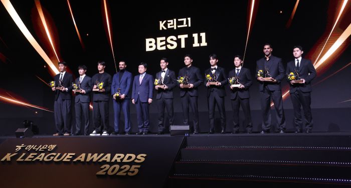 하나은행 K리그 2025 대상 시상식이 1일 오후 서울 서대문구 스위스 그랜드호텔에서 열렸다. K리그1 BEST 11 GK 송범근, DF 대전하나시티즌 이명재, DF 전북 현대 모터스 홍정호, DF FC서울 야잔, DF 대전하나시티즌 김문환, MF 전북현대모터스 송민규, MF 전북현대모터스 박진섭, MF 전북현대모터스 김진규, MF 전북현대모터스 강상윤, FW 수원FC 싸박, 울산HD FC 이동경이 포즈를 취하고 있다. ⓒ데일리안 방규현 기자
