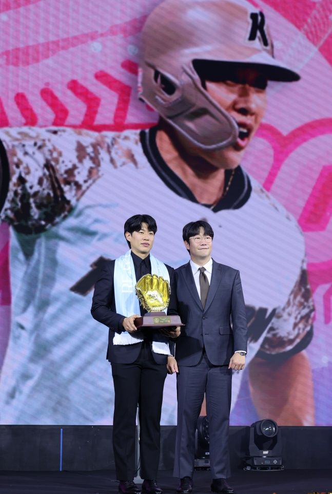 1일 서울 광진구 그랜드 워커힐 서울에서 펼쳐진 '2025 컴투스프로야구 리얼글러브 어워드'에서 올해의 선수상 수상한 송성문이 양현종 한국프로야구선수협회 회장과 기념촬영을 하고 있다.ⓒ 뉴시스