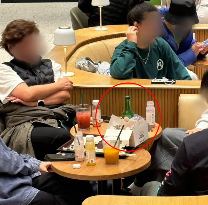 공개된 사진에는 중국인 관광객 6~7명이 앉은 테이블 위에 스타벅스 음료와 함께 치킨과 소주병이 놓여 있는 모습이 담겼다. 스타벅스는 지난 10월13일부터 외부 음식과 음료 취식을 전면 금지하고 있다.
