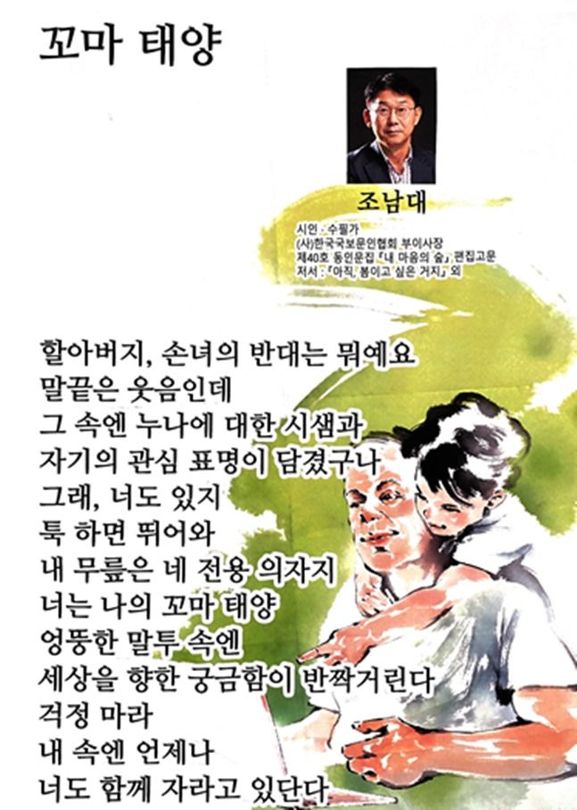 ‘나는 누나보다 할아버지를 더 좋아했는데, 왜 누나에 대한 시만 있을까.’ 손자는 서운함을 원망으로 표현하지 않았다. 대신 “손녀의 반대는 뭐예요?”라는 천연스러운 질문 속에 자신의 서운함을 살며시 숨겨 두었다. 자신을 향한 사랑을 확인받고 싶으면서도 할아버지를 곤란하게 만들지 않으려는 너그러움이 담긴 것이다. 그날 밤, 오랫동안 손자의 말이 머릿속을 맴돌았다. 마침 문학단체의 시화전 원고 청탁을 차일피일 미루던 터였는데, 손자의 말 한마디가 내 안에 불씨를 지폈다. ‘그래, 이번엔 너를 위해 시를 써야겠다.’ 그렇게 며칠을 곱씹으며 태어난 시의 제목은 ‘꼬마 태양’이다. 시는 언제나 누군가를 향한 마음의 등불이다. 그날의 불씨는 내 안에서 오래도록 꺼지지 않았다.