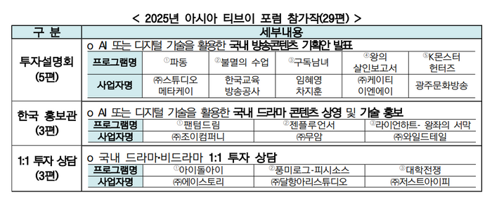 이번 행사에 참가하는 국내 작품은 앞서 ‘2025년 아시아 티브이 포럼 연계 방송콘텐츠 해외유통 지원’ 및 ‘지역방송 콘텐츠 유통 활성화’ 사업 공모를 통해 선정됐으며, 투자설명회에는 5편, 한국 홍보관 3편, 1:1 투자 상담 3편, 지역방송 홍보관 18편(투자상담도 진행) 등 총 29편이 참가한다.
