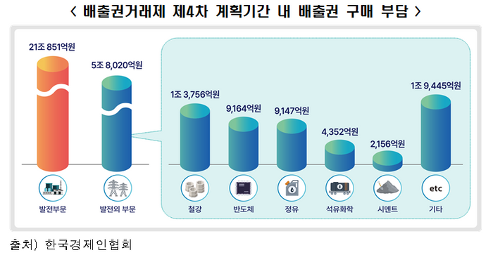 제4차 배출권거래제 할당계획에 따라 배출권 구매 총 비용이 향후 5년간(2026~2030년) 26조9000억원에 달할 것이라는 전망이 나왔다.