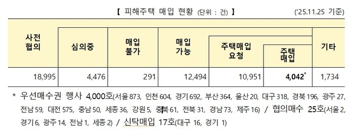 한국토지주택공사(LH)의 전세사기 피해주택 매입실적이 지난달 25일 기준 4042가구로 나타났다. 올 하반기 월평균 595가구(7~11월 평균)를 매입해, 상반기(1~6월) 월평균 162가구 매입 대비 매입속도가 빨라지는 추세다.