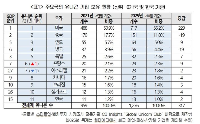 중국은 유니콘 상위 10개국 중 유일하게 감소세를 보였는데, 올해 1월부터 미국 기업의 AI, 양자컴퓨팅, 반도체 분야 중국 스타트업 투자가 금지되는 등 미중 기술 패권 경쟁과 중국 벤처시장 위축의 영향으로 풀이된다. 글로벌 기업 데이터 플랫폼 크런치베이스에 따르면 2024년 중국 벤처투자 규모는 332억 달러로 2021년의 955억 달러와 비교해 3년새 1/3 토막으로 급감했다.