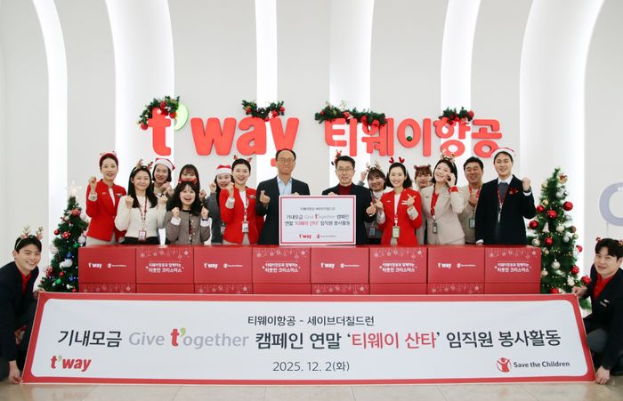 전날 진행된 티웨이항공의 연말 임직원 봉사활동 ‘티웨이 산타’는 국제아동권리 NGO 세이브더칠드런과 함께하는 기내 모금 캠페인 ‘기브 투게더(Give t’ogether)’ 기금을 활용해 국내 아동·청소년들에게 연말 선물을 전달하는 행사다. 행사는 임직원들의 자발적 지원을 통해 진행됐다.