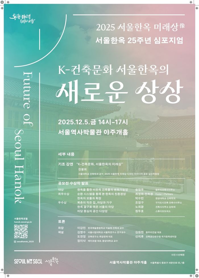 이어 '2025 서울한옥 미래상 디자인 아이디어 공모전'에서 대상을 받은 송정우씨를 비롯한 6개 수상 팀의 주제 발표가 진행된다. 공모전 수상작에 대한 시상식도 이날 심포지엄에서 열린다. 수상작 13점은 모형과 작품 패널 등이 이달 7일까지 종로구 계동 서울한옥지원센터와 마을서재에 특별 전시되며 누구나 관람할 수 있다.