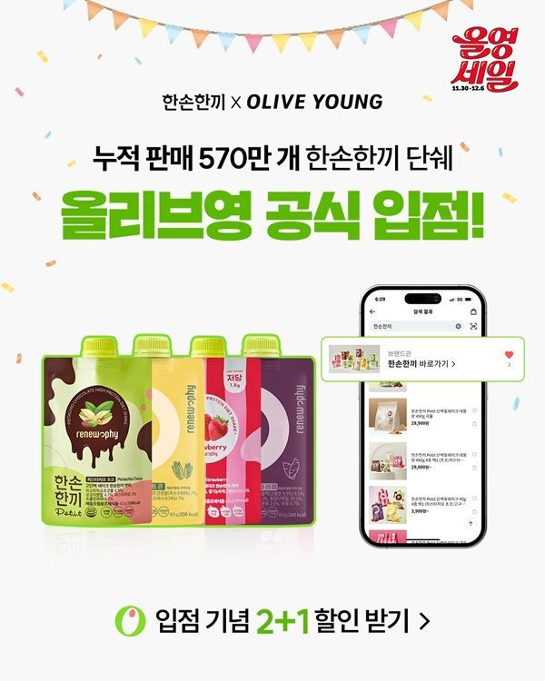 한손한끼 관계자는 “누적 570만 개 판매를 돌파하며 고객들의 신뢰를 얻고 있는 만큼, 올리브영 온라인몰 입점을 통해 더 많은 소비자에게 한손한끼의 균형 잡힌 영양 설계를 소개할 수 있게 되어 의미가 크다”며 “앞으로도 다양한 맛과 활용성을 제안하며 국내뿐 아니라 해외 소비자의 건강한 일상을 돕는 브랜드로 성장해 나가겠다”고 말했다.