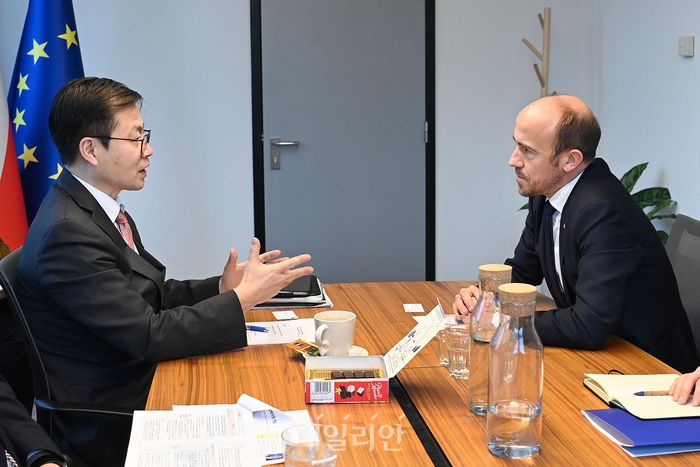 여한구 산업통상부 통상교섭본부장이 2일(현지 시간) 벨기에 브뤼셀에서 보리스 부드카 유럽의회 산업연구위원회 위원장과 면담하고 있다.ⓒ뉴시스
