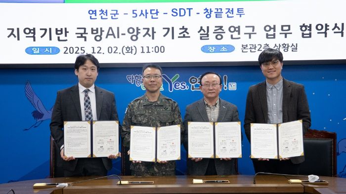 경기 연천군은 지난 2일 군청 상황실에서 육군 제5보병사단, SDT(주), 사단법인 창끝전투와 함께 AI 대전환 시대에 대응하고 지역의 새로운 성장 동력을 확보하기 위한 ‘지역기반 국방 AI·양자 기초 실증연구’ 업무협약을 체결했다고 밝혔다.
