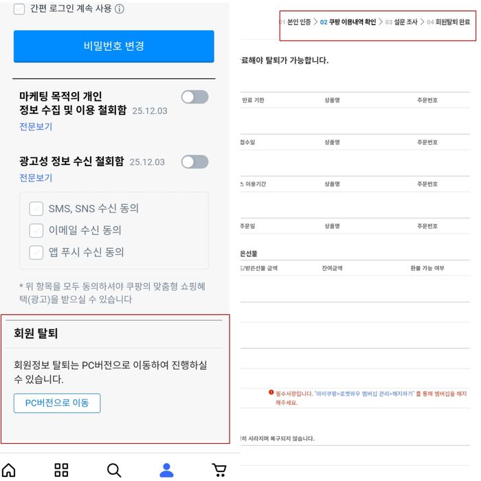 모바일 앱에서 ‘마이쿠팡’으로 들어가 ‘회원정보 수정’을 누른 뒤, 다시 ‘PC 버전으로 보기’를 선택해야 탈퇴 절차가 시작된다.