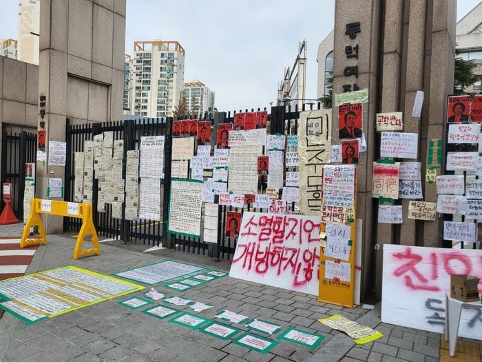 지난해 11월 동덕여대 정문에는 남녀공학 전환에 반대하는 대자보, 포스터 등이 붙어있다.ⓒ데일리안 허찬영 기자
