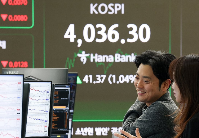 3일 한국거래소에 따르면 코스피지수는 전 거래일 대비 41.37포인트(1.04%) 오른 4036.30에 거래를 마쳤다. 종가 기준 4000선을 회복한 것은 지난달 20일 이후 9거래일 만이다.