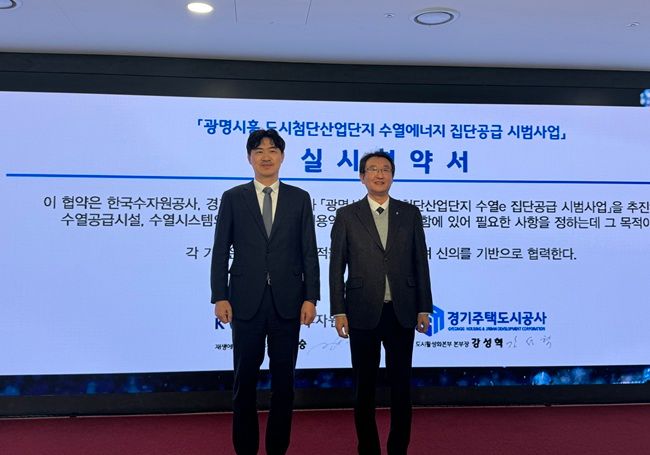 한국수자원공사(K-water, 사장 윤석대)는 3일 경기도 수원에 있는 경기주택도시공사(GH) 본사에서 GH와 ‘광명시흥 도시첨단산업단지 수열에너지 집단공급 시범사업’을 위한 실시협약을 체결했다.