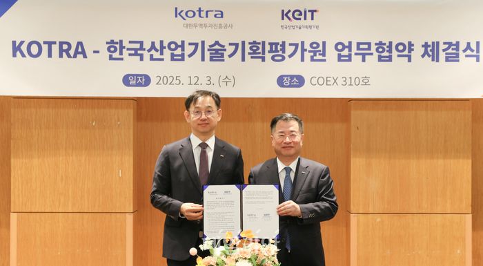 대한무역투자진흥공사(KOTRA)와 한국산업기술기획평가원(KEIT)은 3일 서울 코엑스에서 ‘R&D 수행기업의 해외 진출과 성과 확산을 위한 업무협약(MOU)’을 체결했다. MOU 체결을 통해 AI 전환, 로봇 등 첨단분야 R&D 수행기업의 해외진출 협력망을 촘촘하게 했다.