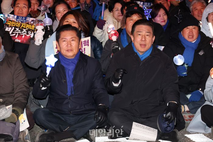 더불어민주당 정청래 대표와 김병기 원내대표가 12.3 비상계엄 1년을 맞은 3일 오후 서울 여의도 국회 앞 국회대로에서 열린 '12.3 내란·외환 청산과 종식, 사회 대개혁 시민 대행진' 집회에서 구호를 외치고 있다.