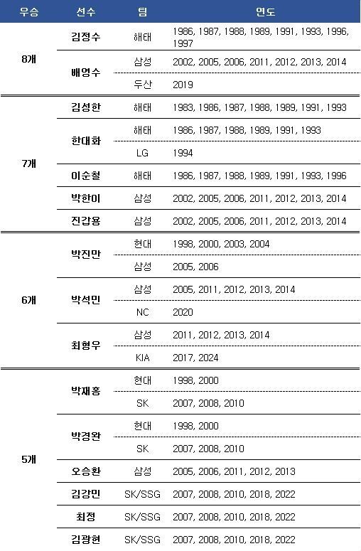 개인 통산 최다 우승을 경험한 선수는 1980년대부터 1990년대까지 해태 왕조를 이끌었던 ‘가을까치’ 김정수와 ‘푸른 피의 에이스’ 배영수의 8개다. 김정수는 오직 해태에서만 8번의 우승을 맛봤고, 배영수는 삼성에서 7번, 그리고 은퇴 직전 두산에서 8개째 반지를 손에 넣었다.