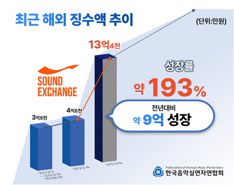 한국음악실연자연합회(이하 음실련)가 “미국 저작인접권 관리단체 사운드익스체인지(SoundExchange)와의 상호관리계약에 따라 약 9억원의 실연권료 추가 징수로 전년 대비 해외 저작인접권 징수액이 약193%증가했다”고 4일 밝혔다.
