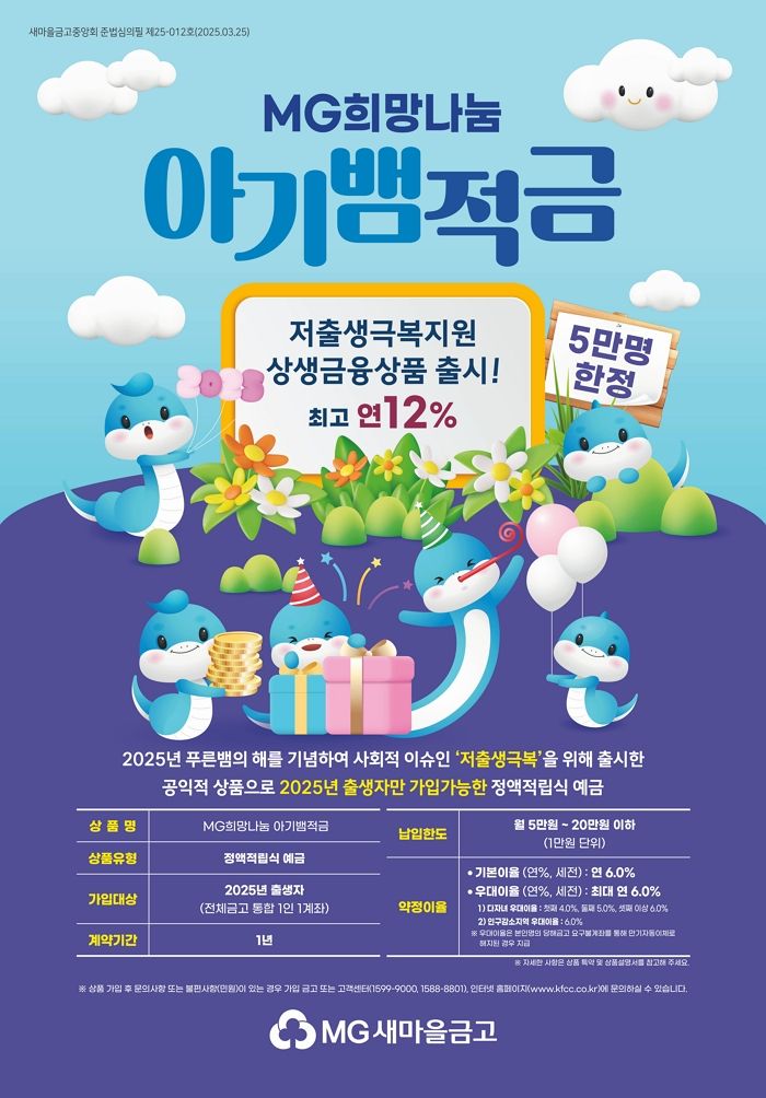 새마을금고는 저출생 극복을 지원하기 위해 지난 4월 출시한 사회공헌 금융상품 'MG희망나눔 아기뱀적금'이 약 4만7000계좌 판매됐다고 4일 밝혔다.