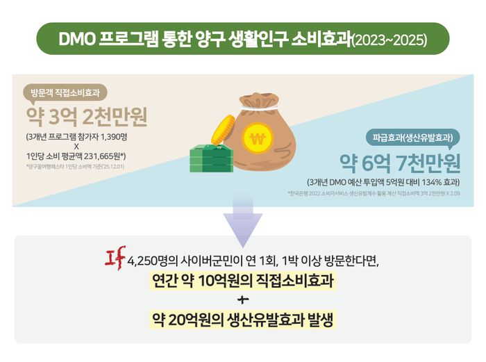 사이버 군민제도와 연계 추진한 ‘양구꿀여행페스타’ 참가자의 1인 평균 소비액은 23만 1665원으로, 농촌진흥청(2024) 조사 기준 농촌 숙박여행 평균 소비액(17만 5944원) 대비 31% 높은 수치를 기록하였다. 3년간 양구DMO 프로그램의 누적 참가자 1390명 기준 양구군 내 직접 소비액은 약 3억 2000만 원, 생산유발효과*는 약 6억 7000만 원으로 추정된다. (*한국은행 2022 소비자서비스 생산유발계수 적용 수치)