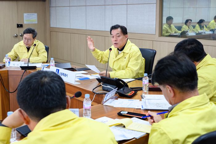 이재준 시장이 '겨울철 도로 제설 대책 상황보고회'에서 내 집·점포 앞 눈 쓸기' 홍보를 당부하고 있다. ⓒ수원시 제공