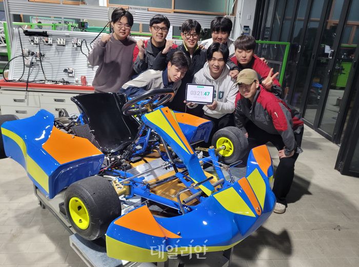 한국폴리텍대학 전북캠퍼스 스마트전기자동차과 학생들이 ‘전동화 카트 및 자동 분무 소화시스템’ 프로젝트 작품을 완성하고 기념 촬영을 하고 있다. ⓒ한국폴리텍대학