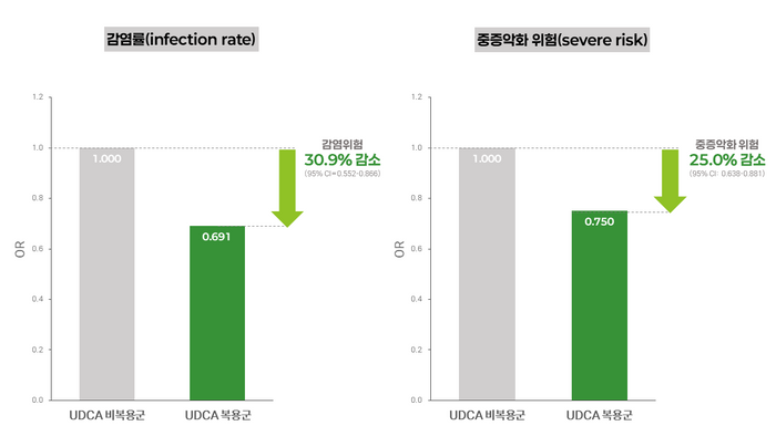 건양대학교병원 허규찬 교수 연구팀이 주도한 이번 연구에서 UDCA 복용군은 비복용군 대비▲COVID-19 감염 위험 31% 감소 ▲중증 악화 위험 25% 감소 ▲인공호흡기 사용 위험 25%감소하는 결과를 보였다.
