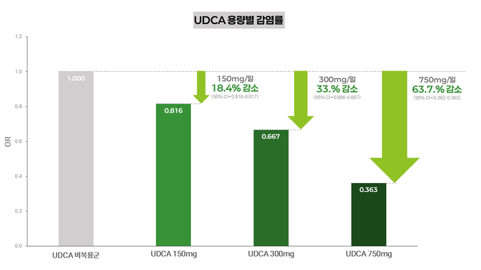 또한 다국가 데이터를 기반으로 복용량이 증가할수록 감염 위험이 단계적으로 감소하는 경향을 확인하며 UDCA 예방 효과에 대한 임상적 근거를 한층 강화했다.