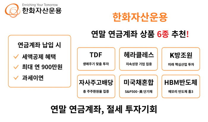 한화자산운용이 연금 투자에 관심이 집중되는 연말을 맞아 연금저축·IRP(개인형 퇴직연금) 등 연금계좌를 채워줄 상품 6종을 추천했다.