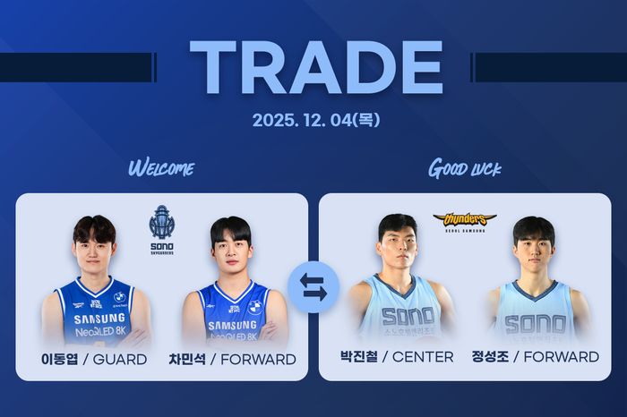 소노는 4일 "센터 박진철(28)과 포워드 정성조(25)를 삼성으로 보내고, 가드 이동엽(31)과 포워드 차민석(24)을 영입하는 2:2 트레이드를 단행했다"고 발표했다.