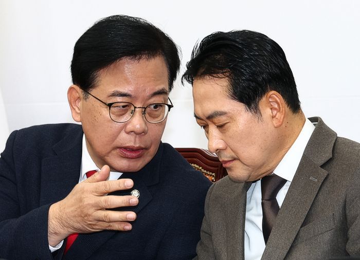 장동혁 국민의힘 대표(오른쪽)와 송언석 원내대표가 4일 오전 국회에서 열린 최고위원회의에서 대화하고 있다. ⓒ뉴시스