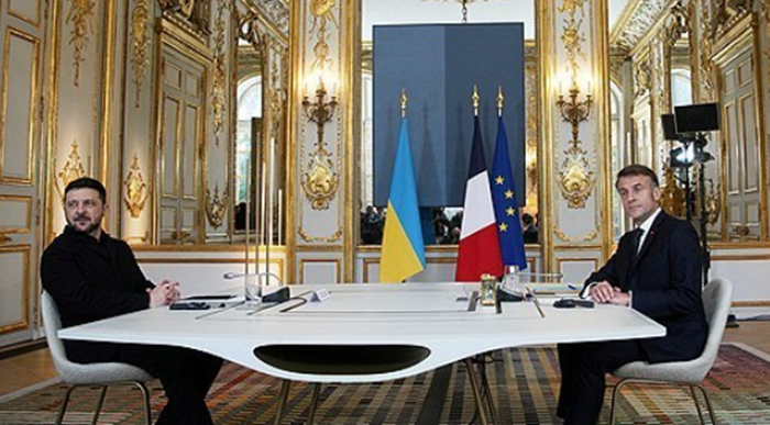 볼로디미르 젤렌스키 우크라이나 대통령과 에마뉘엘 마크롱 프랑스 대통령이 1일 파리에서 만나고 있다. ⓒAP/연합뉴스