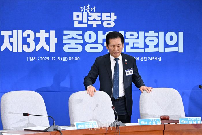 정청래 더불어민주당 대표가 5일 오전 국회에서 열린 민주당 중앙위원회의에 참석하고 있다. ⓒ데일리안 홍금표 기자