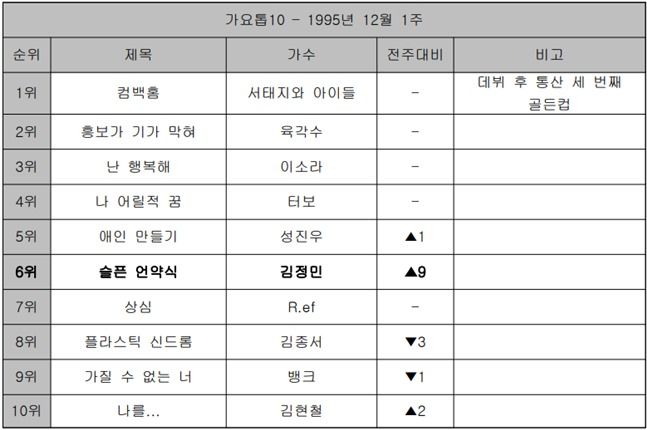 ◆‘가요톱10’ 1995년 12월 1주 : 김정민 ‘슬픈 언약식’