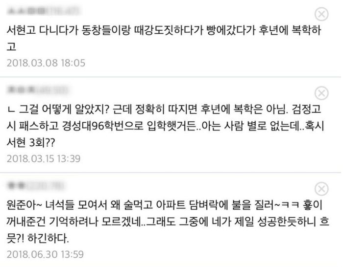 해당 글에 또 다른 누리꾼은 '그걸 어떻게 알았지, 아는 사람 별로 없는데'라고 적었고, '원준아~ 녀석들 모여서 왜 술을 먹고 아파트 담벼락에 불을 질러. 형이 꺼내준 건 기억하려나 모르겠네. 그래도 그중에 네가 제일 성공한 듯하니 흐뭇하긴 하다'는 내용을 댓글로 올렸다.