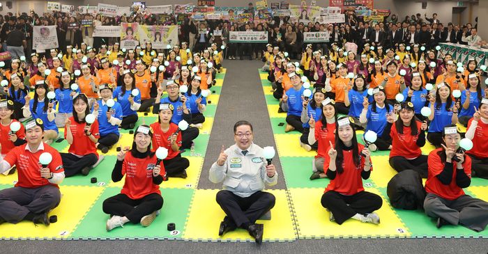 하나은행이 지난 5일 하나금융그룹 명동 사옥에서 전국 외국환 우수직원들이 참여하는 외국환 지식경연 대회인 '2025 외국환 골든벨' 결선 행사를 진행했다. 이호성 하나은행장(가운데)이 대회에 참가한 직원들과 함께 응원 포즈를 취하고 있다.ⓒ하나은행
