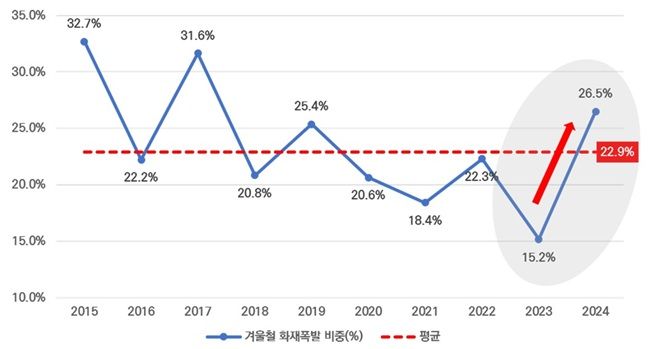 한국해양교통안전공단(KOMSA, 이사장 김준석)이 해양교통안전정보시스템(MTIS)을 통해 최근 10년간 계절별 선박 화재·폭발 사고 비중을 분석한 결과 전체 계절에서 겨울철 선박 화재·폭발 사고 비중은 꾸준히 감소하다가 지난해 26.5%로 반등했다. 이는 동 기간 10년 평균치(22.9%)를 웃도는 수준이다.